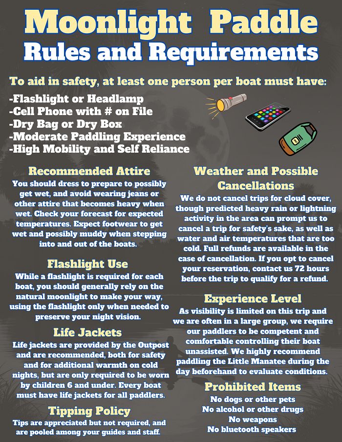 This poster has all the needed information for our upcoming Moonlight Paddle, be sure to review it before calling to make your reservation!